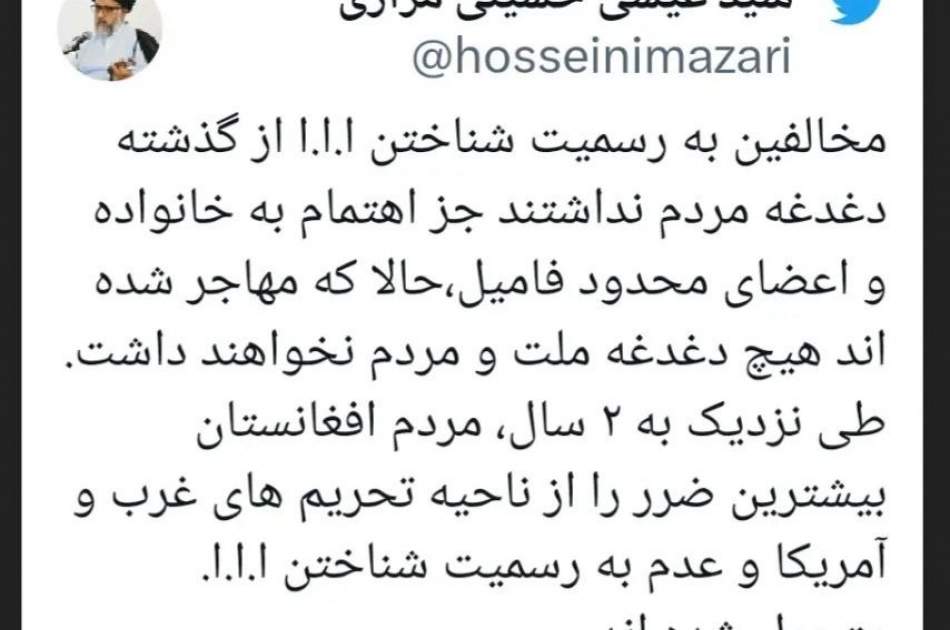 در حالی که نشست ویژه سازمان ملل در مورد افغانستان در دوحه در حال برگزاری است، حجتالاسلام والمسلمین حسینی مزاری با نشر توییتهایی به موضوعات مرتبط با این نشست پرداخته و با تاکید بر اینکه مخالفانِ به رسمیت شناختن امارت اسلامی دغدغهی مردم افغانستان را ندارند، نوشته است: طی نزدیک به دو سال، مردم افغانستان […]