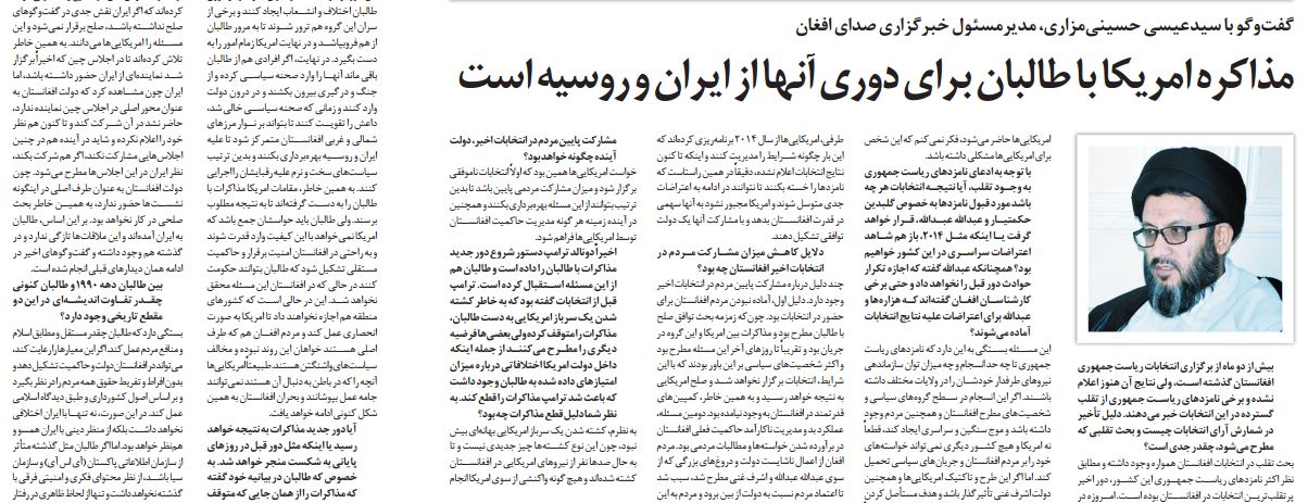 به گزارش خبرگزاری صدای افغان (آوا)؛ حجتالاسلام والمسلمین سید عیسی حسینی مزاری رئیس عمومی مرکز فعالیتهای فرهنگی اجتماعی تبیان در اجتماعی از مهاجرین افغانستانی در حسینیۀ هراتیها شهر تهران به ایراد سخنرانی پرداخت. حسینی مزاری در ابتدای سخنان خود در این مراسم، با امالمصائب دانستنِ حضور غربیها بویژه آمریکاییها در افغانستان، عنوان کرد: در گذشته […]