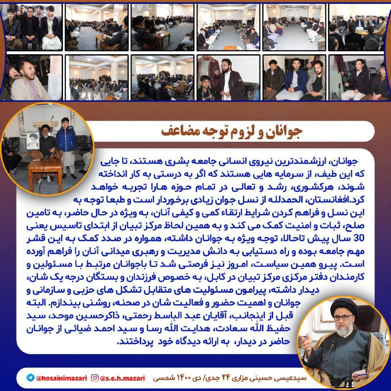 خبرگزاری صدای افغان(آوا) ـ کابل: حجت الاسلام والمسلمین سید عیسی حسینی مزاری، رئیس کل مرکز فعالیت های فرهنگی و اجتماعی تبیان روز جمعه(۱دلو) در دیدار با جمعی از جوانان و نوجوانان در کابل خطاب به آنها گفت: اگر قرار باشد که در جامعه به عنوان مدیر و رهبر عمل کنید، مهمترین ابزار، ابزار بیان است و شما باید […]